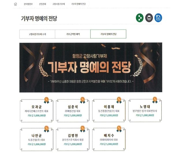 온라인 명예의 전당에는 고향사랑기부금 500만원 이상 기부자의 이름과 소속 등이 게시돼 있다.
