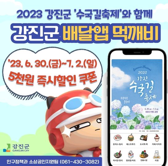 [제주교통복지신문 김강석 기자] 강진군이 수국길 축제 기간에 맞춰 ‘먹깨비’로 주문 시 할인쿠폰을 지급하는 이벤트를 추진한다.