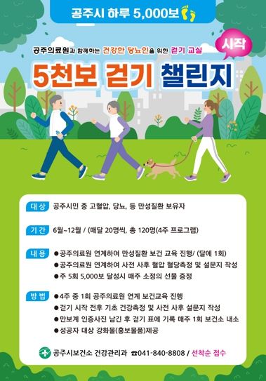 걷기교실은 공주시에 거주하는 만성질환라면 누구나 참여가 가능하다. 참여 신청 및 자세한 사항은 공주시보건소 건강관리과로 문의하면 된다.