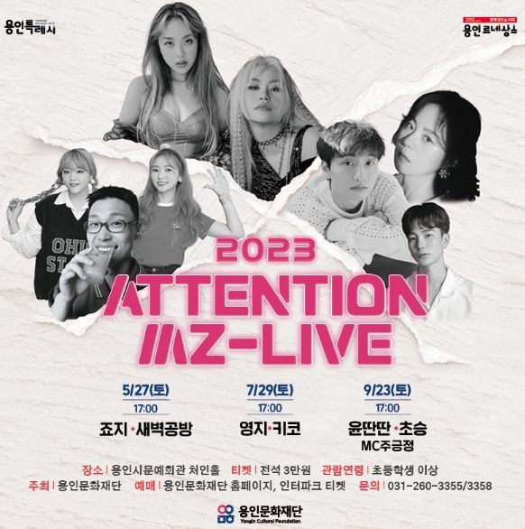'2023 어텐션 엠지 라이브'는 용인의 대중문화예술 활성화와 현 세대를 주도하는 MZ 세대의 문화 충족을 위해 용인문화재단에서 기획한 공연 브랜드로 오는 7월에는 힙합 아티스트로 출연진을 구성했다.
