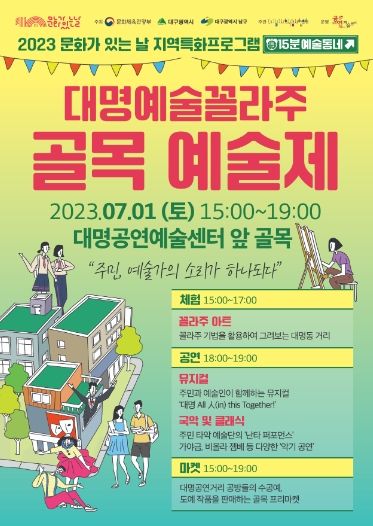 대구 남구는 문화체육관광부의 ‘2023 지역특화프로그램 '문화가 있는 날'’ 공모사업에 선정되어 추진하는 사업으로 6월부터 10월까지 매월 마지막 주 문화가 있는 날 주간마다 다채로운 문화 프로그램을 선보이고 있으며, 그 첫 프로그램으로 오는 7월 1일 대명공연거리에서 주민과 예술가가 함께하는 대명예술꼴라주가 개최된다.
