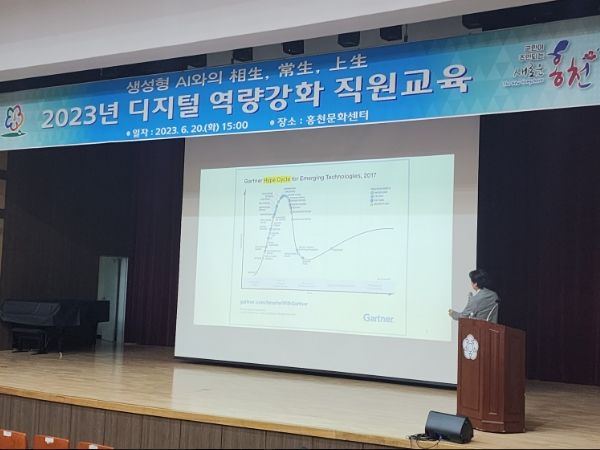 특히 대표적인 생성형 AI인 ChatGPT를 활용한 서류 작성지원, 주민 자동응답시스템, 관광 정보 제공, 업무 지시사항의 전달 자동화 등 홍천군청 공직분야에 적용할 수 있는 올바른 활용법에 대한 방안을 제시하는 교육이 이뤄졌다.