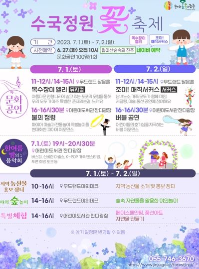 이번 수국정원 꽃 축제는 7월 8일부터 12일까지 5일간 개최하는 정원박람회보다 1주일 앞서 개최하여 박람회 참여 분위기를 확산하고 기대감을 조성하기 위해 다양한 문화행사와 체험, 이벤트를 준비했다. 가족 모두 즐길 수 있는 뮤지컬, 서커스, 버블 공연 등 문화공연과 야간경관과 시원한 저녁 시간을 보낼 수 있는 ‘한여름 밤의 음악회’를 추가로 진행한다. 그 외에도 진성면민이 참여하는 농산물 홍보 장터와 자연물을 활용한 숲 놀이 체험 프로그램을 운영할 예정이다.