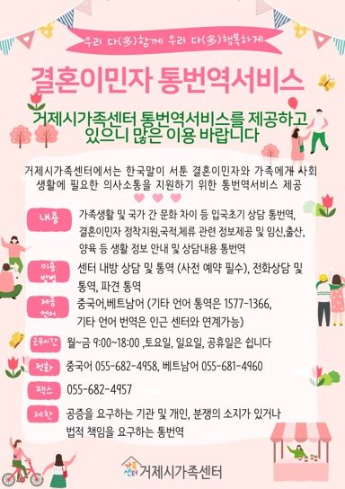 [제주교통복지신문 김강석 기자] 거제시가족센터에서는 다문화가족, 결혼이민자 및 중도입국 자녀가 겪는 의사소통 문제를 해결하기 위한 통·번역서비스를 제공하고 있다.