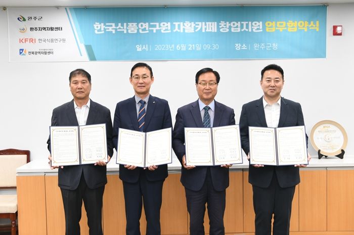 21일 완주군, 한국식품연구원, 완주지역자활센터, 전북광역자활센터 4개 기관은 군청 전략회의실에서 ‘한국식품연구원 카페 창업지원 업무 협약식’을 체결했다.