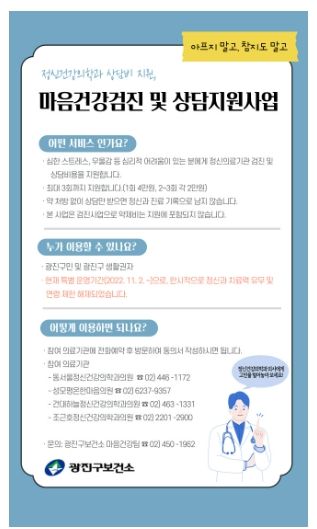 이에 구는, 정신건강 상담비를 지원하고 있다. 비용부담 없이 전문의료기관을 방문해 문제점을 조기에 발견하고 치료하도록 돕는 취지다. 광진구에 거주하거나 생활권을 둔 누구나 지원받을 수 있다.
