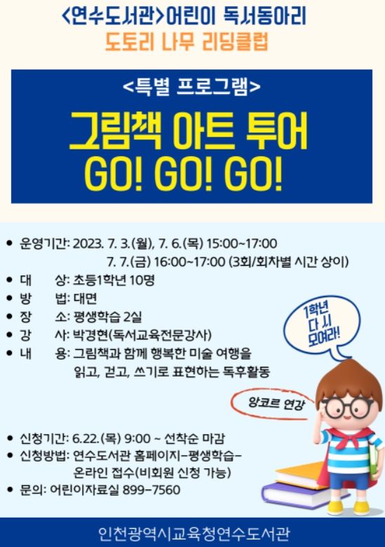 [제주교통복지신문 김강석 기자] 인천광역시교육청연수도서관은 어린이의 꾸준한 독서 습관 형성과 독서동아리 활성화를 위해 '어린이 독서동아리(도토리 나무 리딩클럽)' 특별 프로그램을 운영한다고 21일 밝혔다.