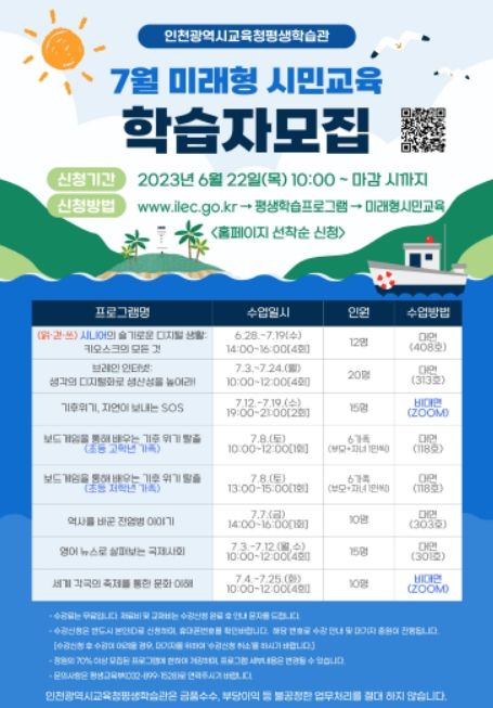 [제주교통복지신문 김강석 기자] 인천광역시교육청평생학습관은 인천시민과 학부모, 교직원을 대상으로 ‘7월 맞춤형 프로그램’을 운영한다고 21일 밝혔다.
