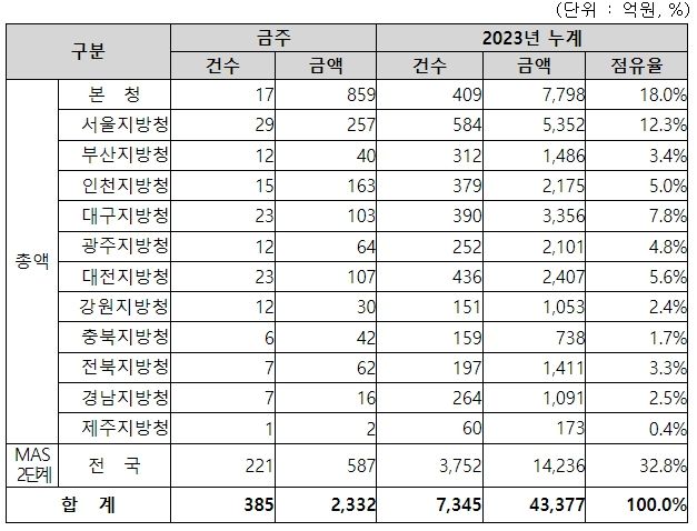 지역별 발주량을 보면, 총액계약 대상 1,745억 원 중 본청이 859억 원으로 49.2%를 집행하고 서울청 등 11개 지방청에서 886억 원을 각각 집행할 예정이다.