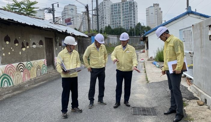 최성민 부시장과 관계 공무원은 합판지구 급경사지 붕괴위험지역, 두계2 자연재해위험개선지구, 팥거리 지하차도, 계룡고 사거리 배수로 등 풍수해 취약지역에 대하여 집중 점검을 전개했다.