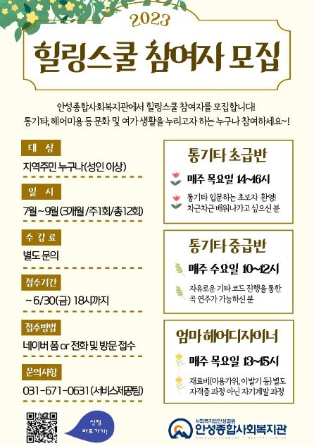 힐링스쿨은 안성에 거주하는 성인 이상 지역주민 누구나 참여 가능하며, 7월 5일부터 3개월 동안 총 12회기 진행될 예정이다.
