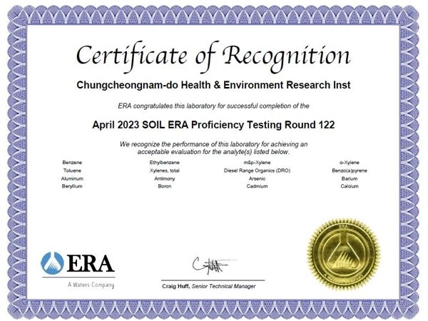 [제주교통복지신문 김강석 기자] 충남도 보건환경연구원은 미국 환경자원학회(ERA, Environmental Resource Associates)가 실시한 ‘토양분야 국제 숙련도 시험’에서 전 항목 모두 ‘만족(Satisfactory)’으로 우수분석기관(Laboratory of Excellence) 인증서를 획득했다고 21일 밝혔다.