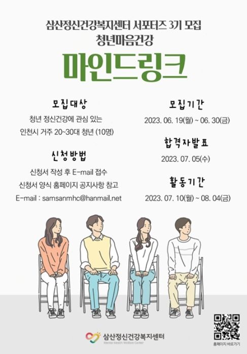 [제주교통복지신문 김강석 기자] 인천시 부평구 삼산정신건강복지센터가 오는 30일까지 ‘마인드링크’ 서포터즈 3기 참여자를 모집한다.