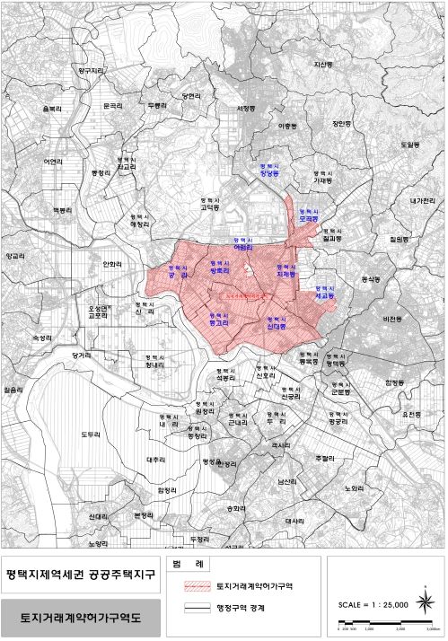 이번 토지거래허가구역 지정 대상 지역은 평택시 모곡동, 세교동, 지제동, 신대동, 장당동, 고덕면 궁리⋅동고리⋅방축리⋅여염리 일대에 총 14.6㎢가 지정됐다.