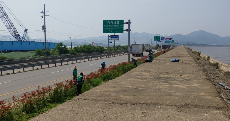 평택호 방조제에 황금사철나무와 홍가시 레드로빈을 심은 지 한 달여 만에 무럭무럭 자라난 잡초 등이 나무 본연의 멋을 저해했고, 이에 평택시 현덕면 행정복지센터에서는 지난 19일에 평택호 방조제에서 제초작업을 진행했다.
