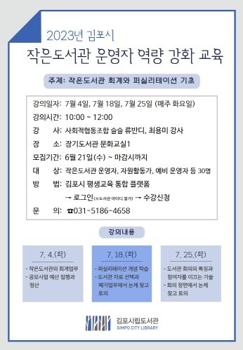 [제주교통복지신문 김강석 기자] 김포시 시립도서관은 관내 사립작은도서관 운영 활성화 사업을 위한 계획의 하나로 ‘작은도서관 운영자 역량 강화 교육’을 실시한다.