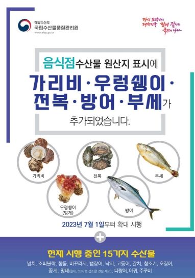 현재까지의 음식점 ‘수산물 원산지표시 대상 품목’은 넙치, 조피볼락, 참돔, 미꾸라지, 뱀장어, 낙지, 고등어, 갈치, 오징어, 꽃게, 참조기, 다랑어, 아귀, 주꾸미, 명태(황태, 북어 등 건조한 것 제외) 15가지와 조리해서 판매·제공하기 위해 수족관 등에 보관·진열하는 살아있는 수산물이다. 개정 법률이 시행되는 7월 1일부터는 기존 품목에 가리비, 우렁쉥이, 전복, 방어, 부세 5가지 품목이 추가된다.