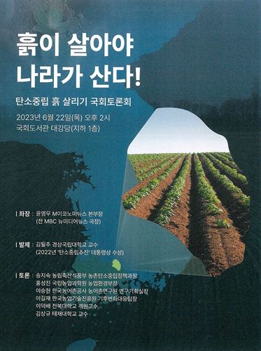 [제주교통복지신문 김강석 기자] 국회의원 서삼석·서동용·신정훈·이태규·홍정민 의원 등과 전라남도 구례군이 공동주최하고, ㈜방송문화미디어텍과 탄소중립흙살리기운동본부가 주관하는 '흙이 살아야 나라가 산다'의 국회토론회가 내일(22일) 목요일 오후 2시부터 국회도서관 대강당에서 열린다.