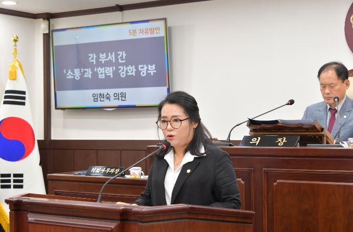 [제주교통복지신문 김강석 기자] 동두천시의회 임현숙 의원(더불어민주당, 나선거구)이 지난 21일 열린 제321회 동두천시의회 정례회 제5차 본회의에서, 5분 자유발언을 통해 각 부서 간의 ‘소통’과 ‘협력’ 강화를 당부했다.