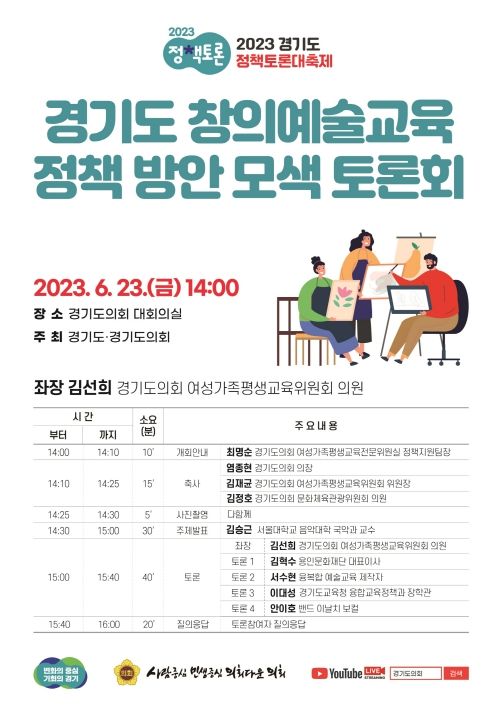 [제주교통복지신문 김강석 기자] 경기도의회 여성가족평생교육위원회 김선희(국민의힘, 수원7) 의원이 좌장을 맡은 ‘경기도 창의예술교육 정책 방안 모색’ 토론회가 오는 6월 23일 14시 경기도의회 대회의실에서 개최된다. 이번 토론회는 경기도와 경기도의회가 공동으로 주최하는 ‘2023 경기도-경기도의회 정책토론 대축제’의 일환으로 열린다.