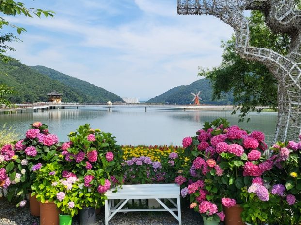 또 전시장에는 가랜드, 벤치 등 포토존을 설치해 추억을 남길 수 있는 공간도 구성되어 있으며 시원한 옥연지를 배경으로 한 수국은 그 자체로도 포토존의 모습을 보이고 있다.