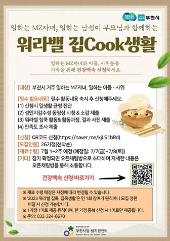 [제주교통복지신문 김강석 기자] 부천시일쉼지원센터는 일하는 MZ세대 자녀와 일하는 남성(아들, 사위)이 부모님과 함께 소통과 돌봄의 시간을 갖도록 '워라밸 집Cook 생활'프로그램 참가자를 모집한다.