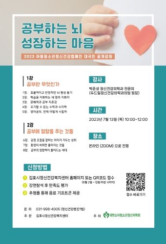 [제주교통복지신문 김강석 기자] 김포시정신건강복지센터는 오는 7월 13일 오전 10시부터 12시까지 2023년 아동·청소년 대국민 공개강좌 ‘공부하는 뇌, 성장하는 마음’을 온라인 ZOOM을 통해 실시간으로 진행한다.