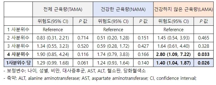 그 결과, 건강하지 않은 근육량(LAMA)을 가장 많이 가진 환자군(상위25%)이 가장 적게 근육량을 가진 환자군(하위 25%)에 비해 간 섬유화 진행 위험도가 2.8배 높은 것으로 확인됐다.