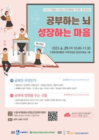 [제주교통복지신문 김강석 기자] 수원시는 6월 29일 오전 10시 수원화성박물관 다목적강당에서 ‘공부하는 뇌 성장하는 마음’을 주제로 2023 아동청소년정신건강캠페인 대국민 공개강좌를 연다.