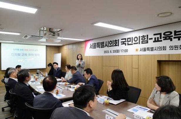 [제주교통복지신문 김강석 기자] 20일 서울시의회 국민의힘(대표의원 최호정)은 교섭단체 주관으로 윤석열 정부의 디지털 전환기 교육정책 방향과 준비사항에 대한 이해를 높이고 중앙정부와 시의회 차원의 협의를 모색하기 위한 간담회를 개최했다. 교육부의 디지털 기반 정책을 설명하기 위해 교육부 디지털교육전환담당관과 디지털인프라담당관이 참석했다.