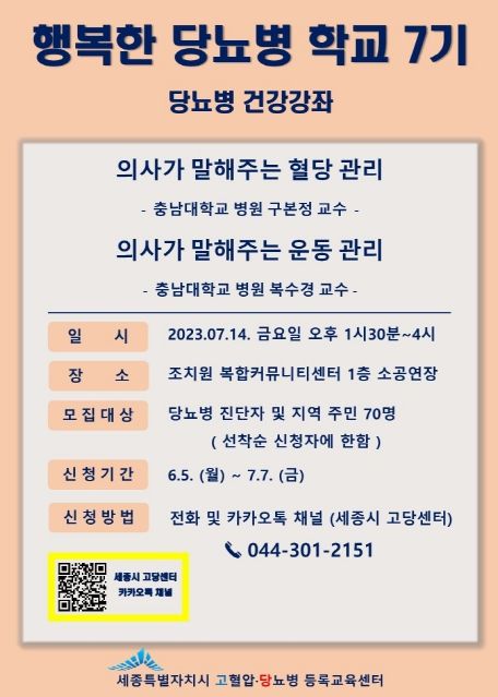 [제주교통복지신문 김강석 기자] 세종특별자치시 고혈압·당뇨병 등록교육센터가 오는 7월 14일 ‘행복한 당뇨병 학교 7기’ 행사를 여는 가운데 오는 7월 7일까지 참가자 신청을 받는다.