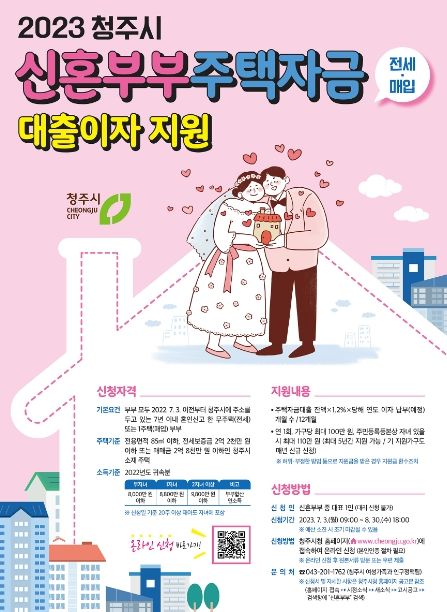 지원 대상은 주택자금을 대출한 신혼부부(혼인신고일 기준 7년 이내)로, 부부 모두 2022년 7월 3일 이전부터 청주시에 주소를 두고 있어야 한다.