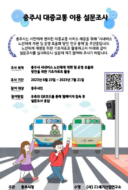 설문 조사 결과는 2024년 1월 시행을 목표로 진행 중인 ‘충주시 시내버스 노선체계 개편’에 대한 기초자료로 활용할 예정이다.