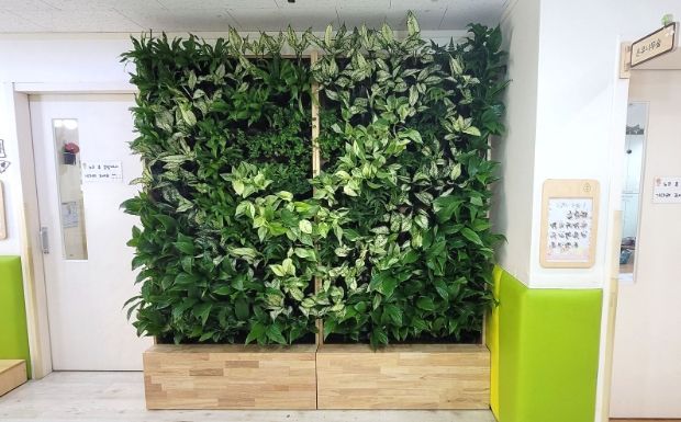 ‘식물 공기 정화시스템’은 공기정화에 뛰어난 스킨답서스, 홍콩야자 등 식물을 실내 벽면에 식재해 미세먼지 저감과 공기질 개선에 효과 있는 시설이다. 식물벽, 바이오월, 수직정원으로 불리며 온·습도 유지, 정서적 안정감 부여 등에도 효과가 있다. 자동 관수 장치가 있어 유지 관리에도 용이하다.