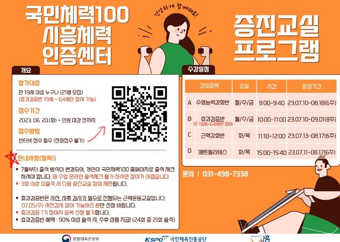 [제주교통복지신문 김강석 기자] 시흥시가 운영하는 국민체력100 시흥체력인증센터에서 ‘2023년 체력증진교실’ 회원을 20일부터 모집하고 있다.