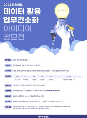 [제주교통복지신문 김강석 기자] 충남도는 ‘데이터 연계·활용을 통한 업무 간소화 아이디어 공모전’을 개최, 다음 달 14일까지 응모 신청을 받는다고 밝혔다.