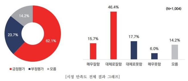 [제주교통복지신문 김강석 기자] 대전시가 민선 8기 1주년을 맞아 시정 만족도 여론조사를 진행한 결과, 시민 62.1%가 시정 운영에 대해 긍정적으로 평가한 것으로 나타났다.
