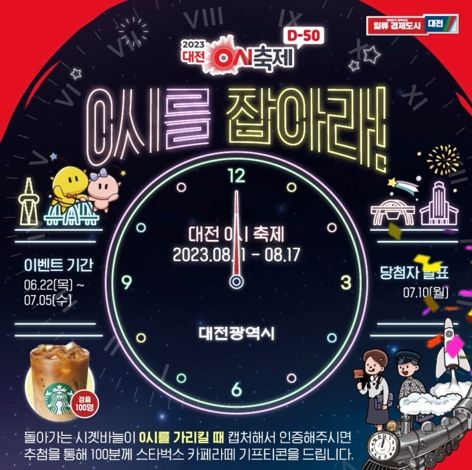 이번 이벤트는‘대전 0시 축제’홈페이지, 대전시 페이스북·인스타그램 등 SNS 게시글에서 돌아가는 시곗바늘이 0시를 가리킬 때를 정지해 인증하고, 함께하고 싶은 친구를 초대하거나 개인 SNS에 이벤트 게시물을 공유하면 된다.