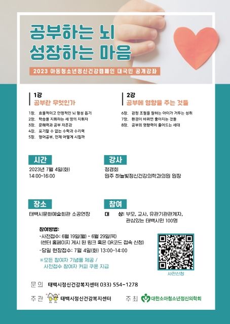 공개강좌 신청은 오는 29일(목)까지 태백시정신건강복지센터 홈페이지에 게시된 사전 신청 주소 또는 모바일(QR코드)을 통해 가능하며, 당일 현장 접수도 가능하다.