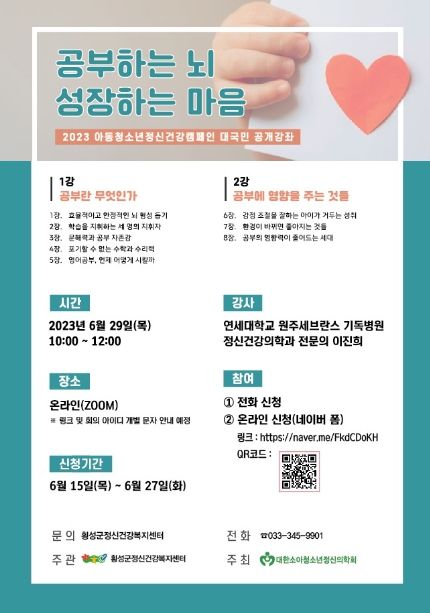 대국민 공개강좌는 대한소아청소년정신의학회에서 주최하고, 횡성군정신건강복지센터에서 주관하여 ‘공부하는 뇌 성장하는 마음’을 주제로 진행된다.