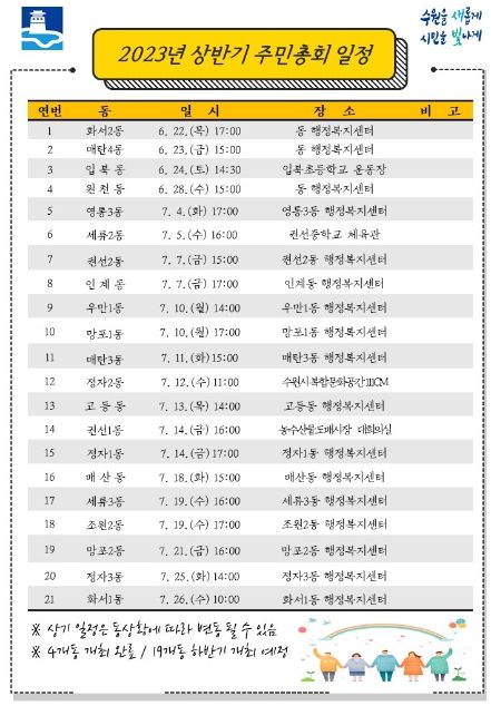 [제주교통복지신문 김강석 기자] 수원시 44개 전체 동이 6월부터 하반기까지 주민총회를 개최한다.