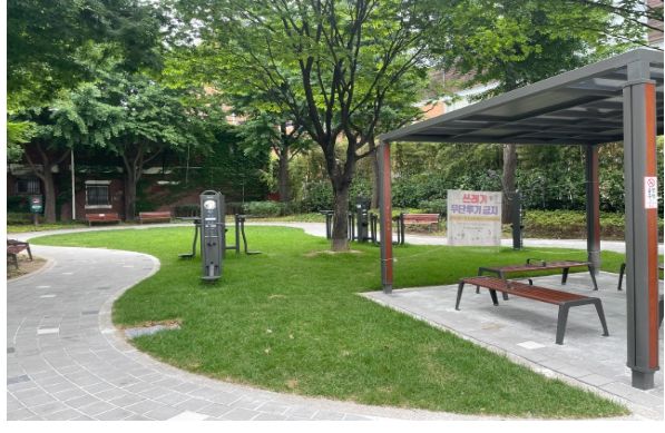 구는 공원을 정비하면서 빗물을 저장하는 '빗물 저금통'을 활용했다. 빗물 저금통은 ▲빗물을 저장할 수 있는 저금통 ▲잔디매트 ▲띠 녹지 보호판으로 구성되어 있다. 비가 내릴 때 지면으로부터 빗물을 저장하여 물 순환시설을 조성해 열섬현상을 완화하는 등 기후위기 대응을 위한 물 순환 통합시스템이라 볼 수 있다.