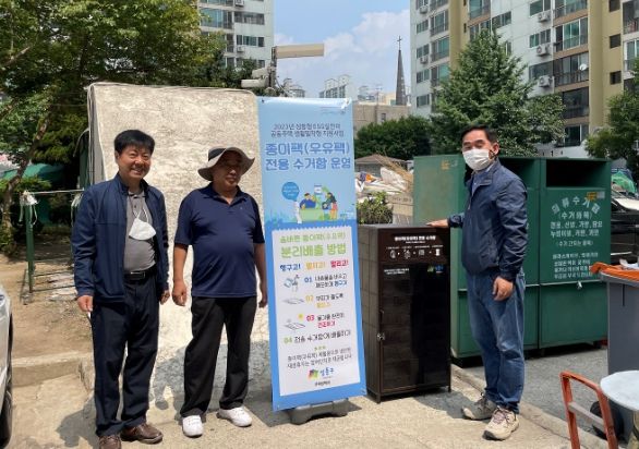 우선 구에서는 종이팩 분리배출에 대한 주민들의 관심과 버려지는 종이팩 재활용률을 높이고 탄소 절감 실천에 동참하기 위해 공동주택 내 ‘종이팩 전용 수거함’을 설치했다.
