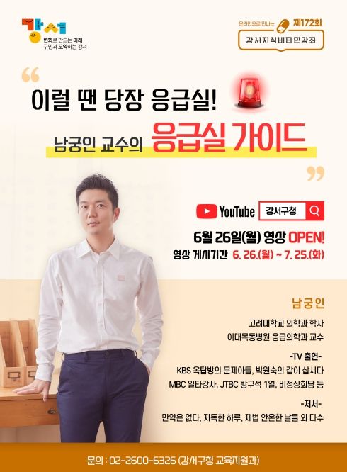 서울 강서구는 ‘응급실 가이드‘를 주제로 제172회 강서지식비타민강좌를 개최한다.