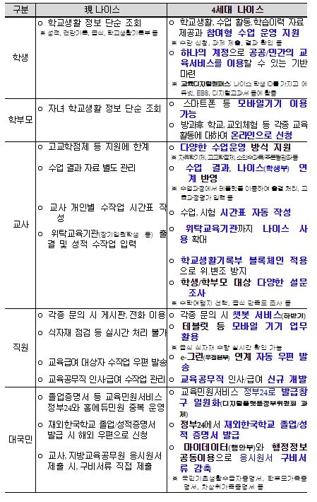 “4세대 나이스”는 2010년에 구축한 나이스의 노후 장비를 교체하면서 고교학점제, 교육과정 개편 등의 교육정책 변화를 반영했고, 태블릿·스마트폰 등 사용자의 이용환경 변화를 고려하여 서비스를 개편했다.