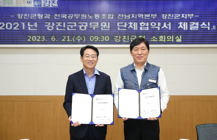 [제주교통복지신문 김강석 기자] 지난 21일, 강진군과 전국공무원노동조합 전남지역본부 강진군지부가 ‘강진군공무원 단체협약’을 체결했다.