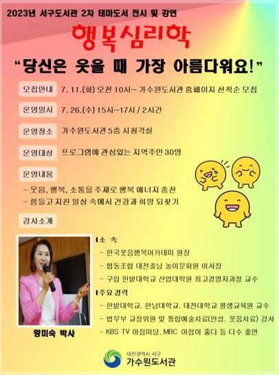 테마 강연은 7월 26일 가수원도서관에서 대면으로 진행되며 대전에서 웃음행복 강의를 진행하고 있는 황미숙 박사가 강연을 펼칠 예정이다. 황미숙 박사는 한밭대, 한남대 등에서 평생교육 교수로 재직 중이며, 관공서, 기업체 등에서 웃음행복 특강을 활발히 펼치고 있다.