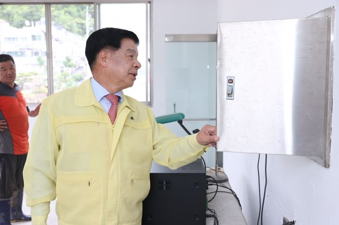 [제주교통복지신문 김강석 기자] 이상근 고성군수가 6월 21일 낙뢰 피해를 받은 고성읍 정동마을 회관을 방문해 마을방송 시설을 둘러보며 안전을 챙겼다.