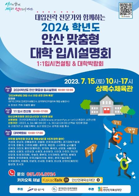 설명회는 문희태 한국대학교육협의회 대입 상담교사를 초빙해 ‘2024학년도 대입 수시지원 성공전략’이라는 주제로 90분간 진행하며, 안산교육지원청 소속 전문 상담교사들이 개인별 성적분석을 통해 1대 1 컨설팅을 제공하고, 맞춤형 대입 성공전략을 제시한다.