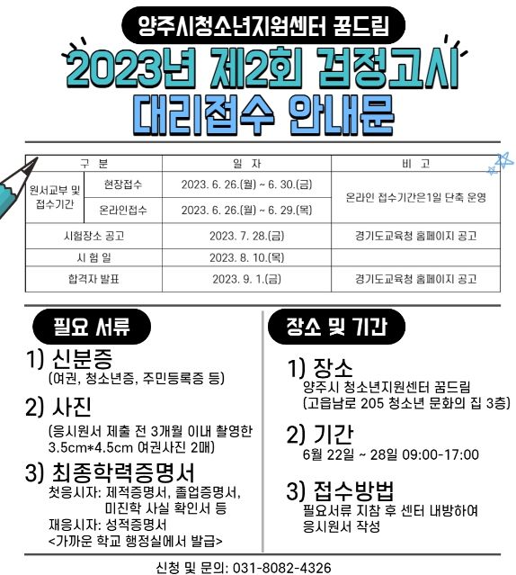 [제주교통복지신문 김강석 기자] 양주시학교밖청소년지원센터는 학교 밖 청소년들을 위해 2023년 제2회 초·중·고 졸업 학력 검정고시 응시 접수 대행을 지원한다.